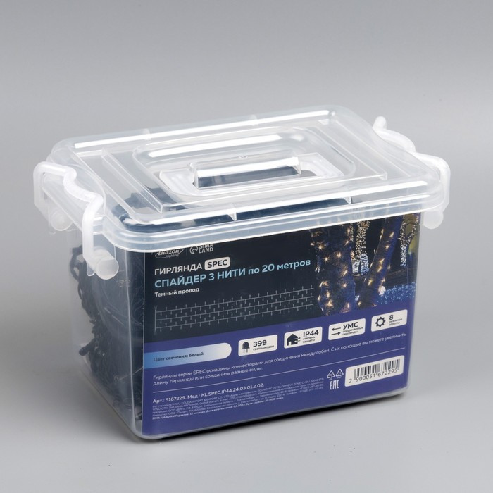 Гирлянда «Клип-лайт» 3 нити по 20 м, IP44, УМС, тёмная нить, 399 LED, свечение белое, 8 режимов, 24 В