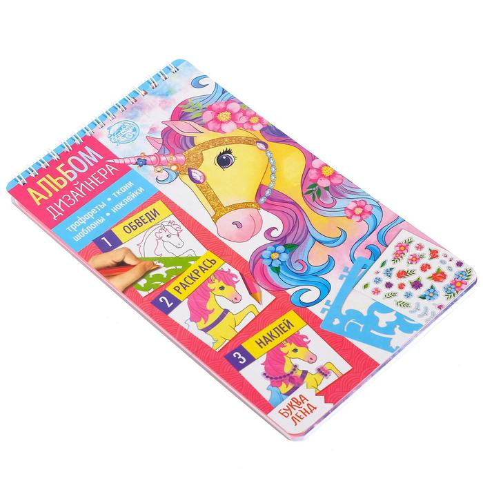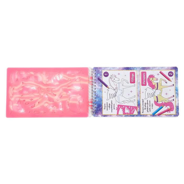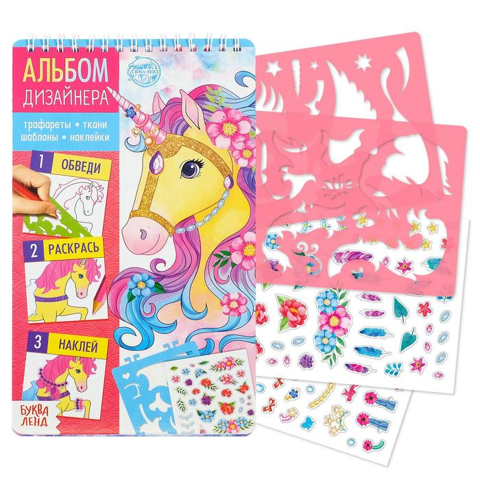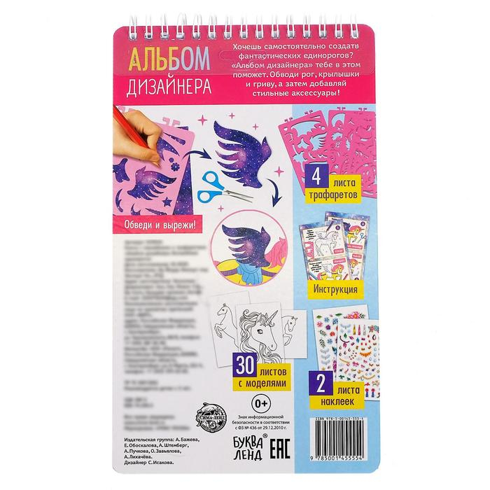 Книга с наклейками и трафаретами «Альбом дизайнера. Волшебные единороги»