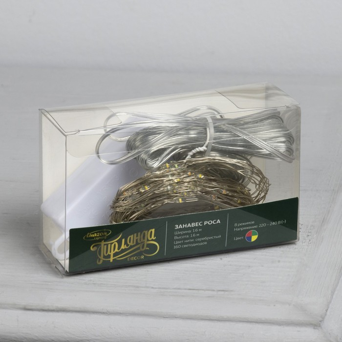 Гирлянда «Занавес» 1.6 × 1.6 м роса, IP20, серебристая нить, 160 LED, свечение мульти, 8 режимов, 220 В
