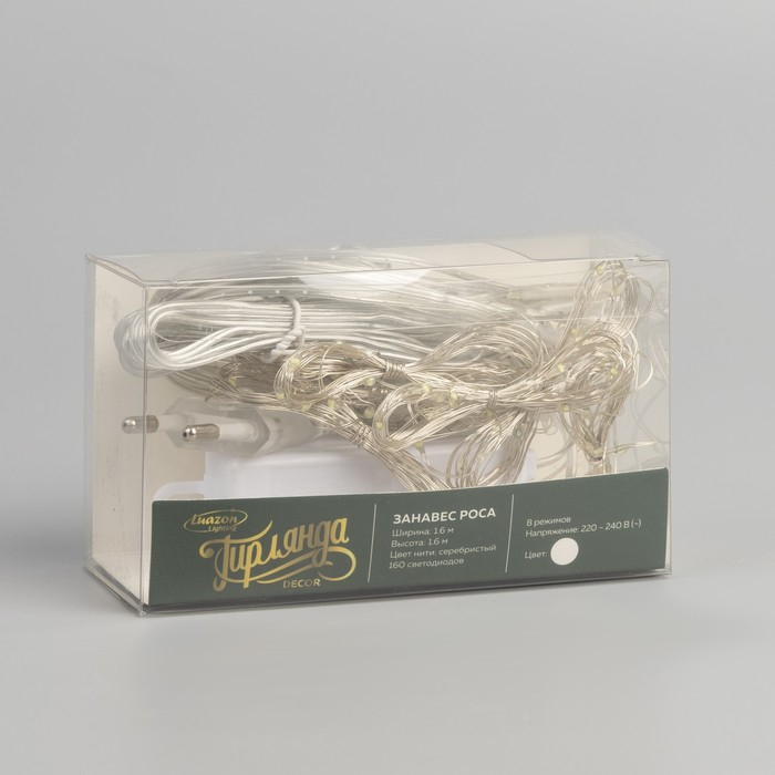 Гирлянда «Занавес» 1.6 × 1.6 м роса, IP20, серебристая нить, 160 LED, свечение белое, 8 режимов, 220 В