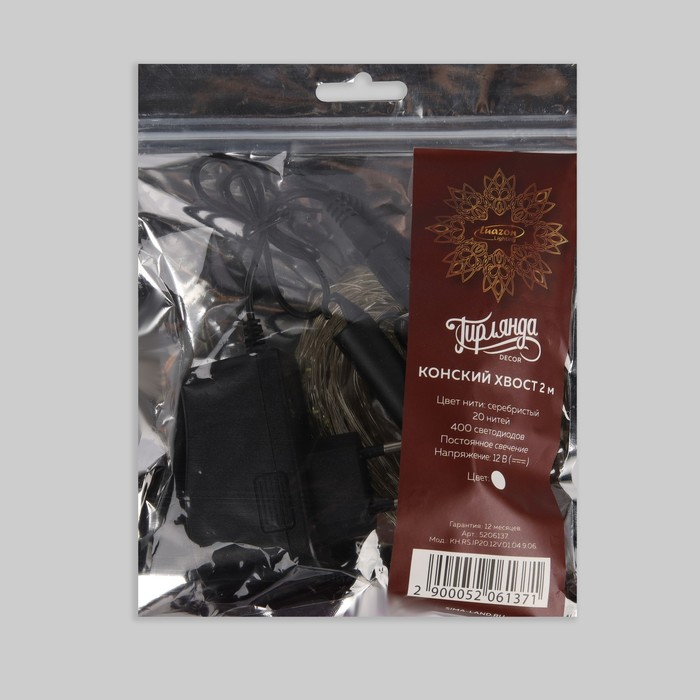 Гирлянда «Конский хвост» 20 нитей по 2 м, IP20, серебристая нить, 400 LED, свечение белое, 12 В