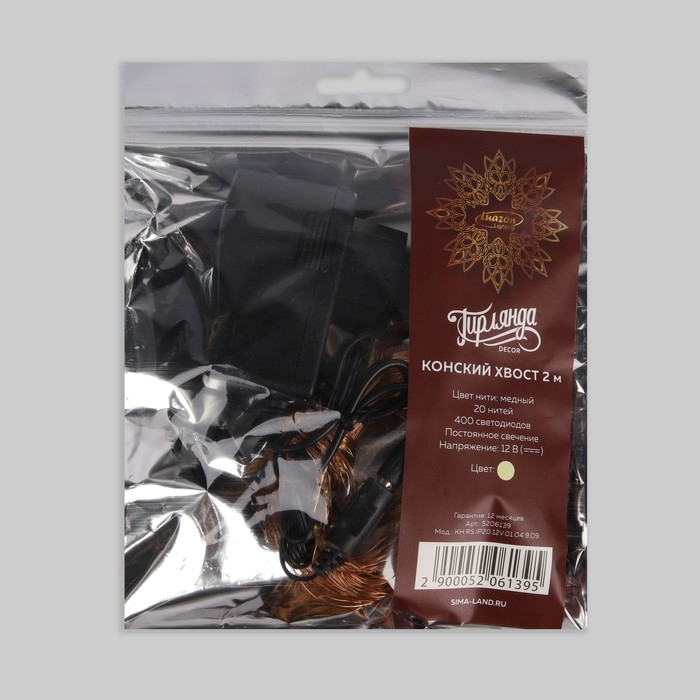 Гирлянда «Конский хвост» 20 нитей по 2 м, IP20, медная нить, 400 LED, свечение тёплое белое, 12 В
