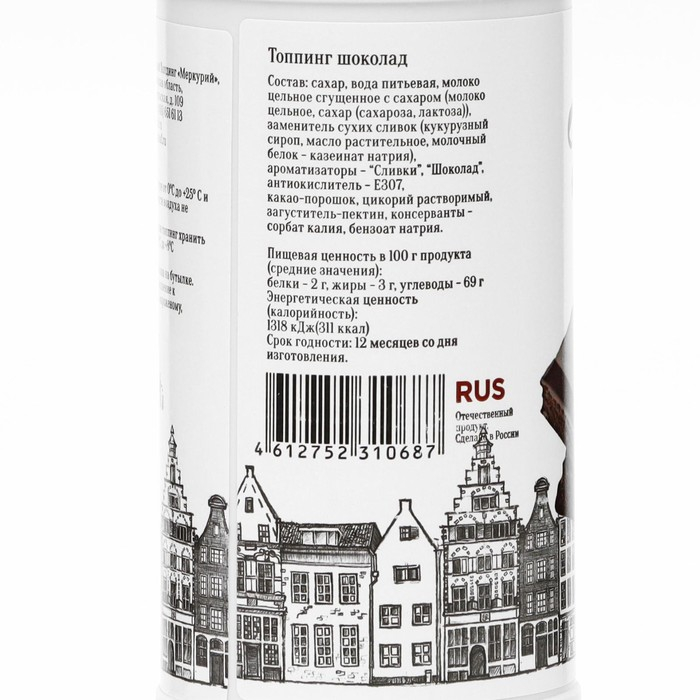 Состав: сахар, вода питьевая, молоко цельное сгущенное с сахаром (молоко цельное, сахароза, лактоза), заменитель сухих сливок (кукурузный сироп, масло растительное, молочный белок казеинат натрия), ароматизаторы: «Сливки», «Шоколад», антиокислитель E307, какао-порошок, цикорий растворимый, загуститель пектин, сорбат калия, бензоат натрия.