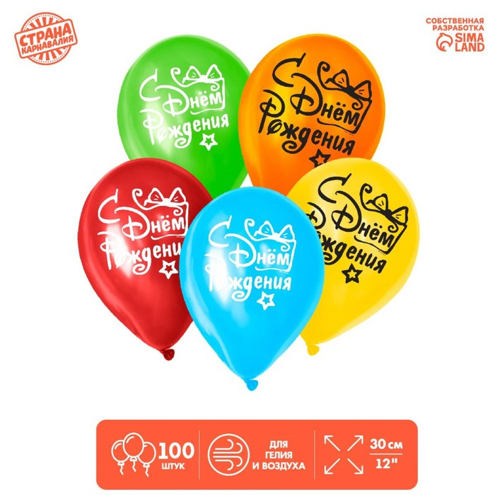 Воздушный шар латексный 12" "С днём рождения", подарок с бантом, 100 шт.