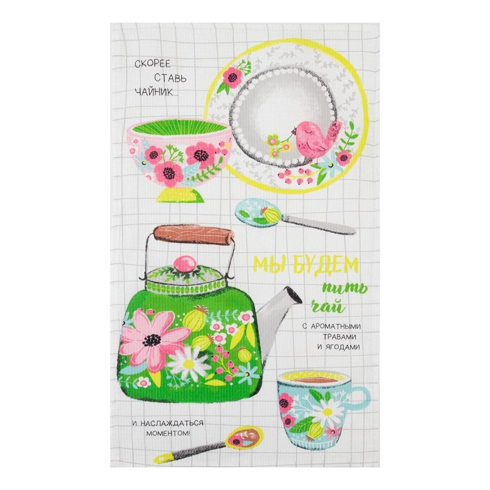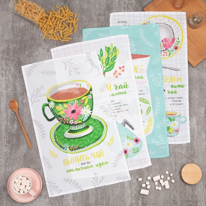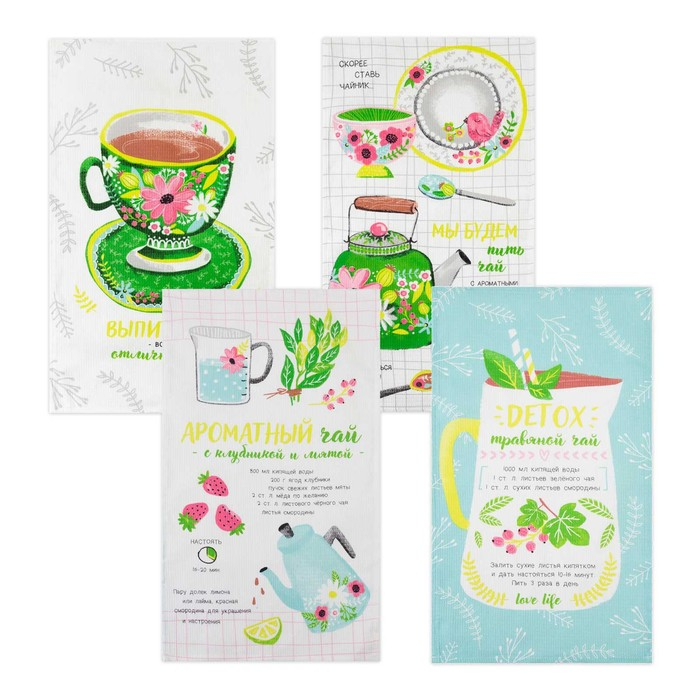 Набор кухонных полотенец Доляна «Ароматный чай», 35х60см-4 шт, 100% хлопок, вафля 160 г/м2