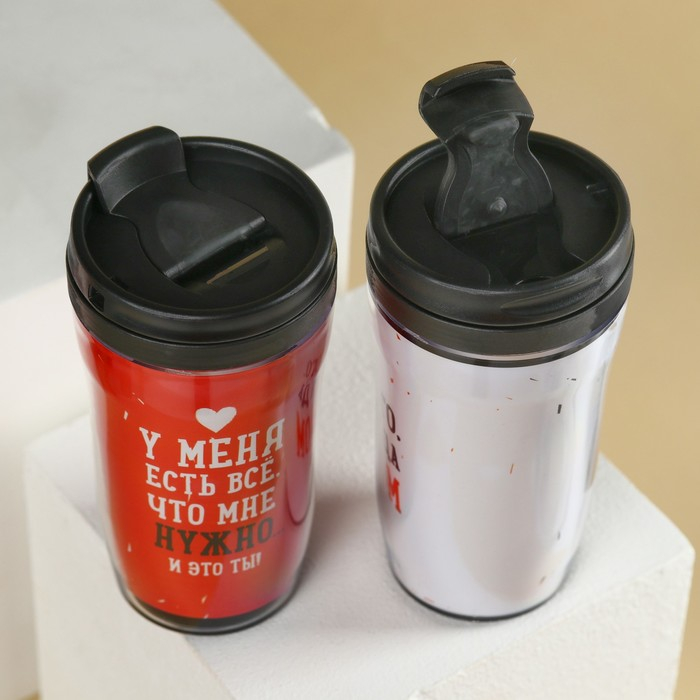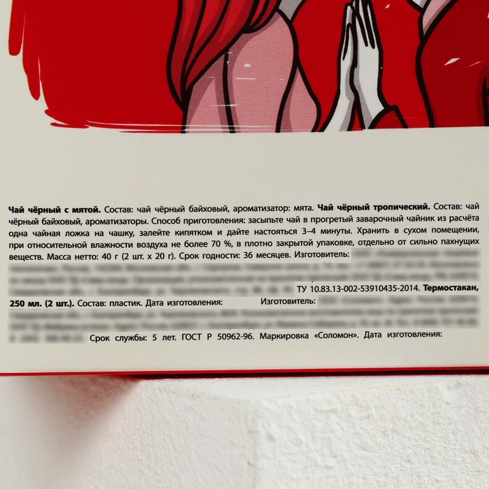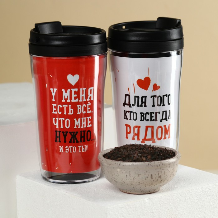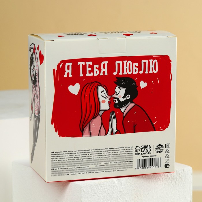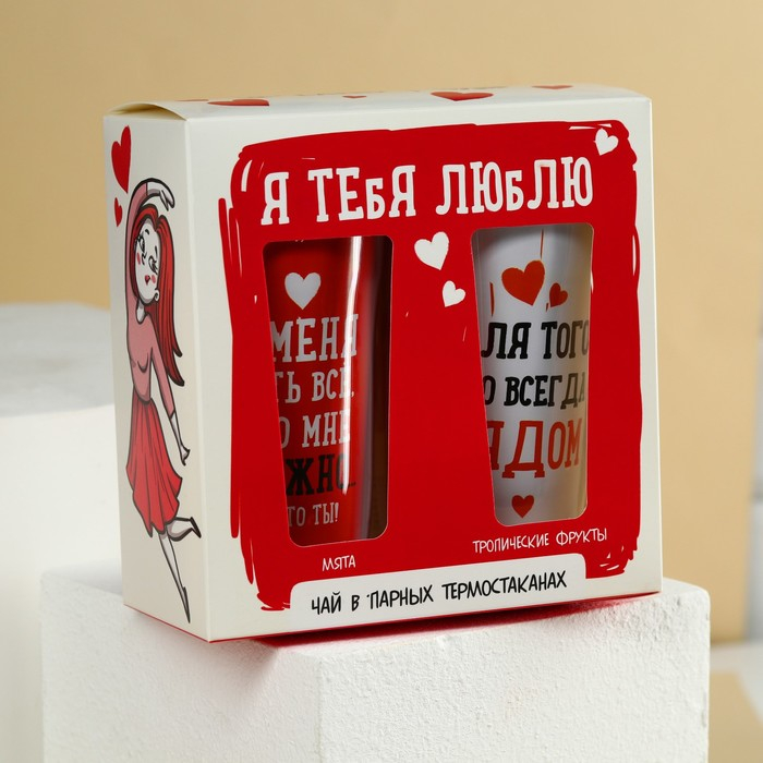 Набор парных термостаканов с чёрным чаем, 2 шт. х 250 мл. «Люблю», мята 20 г., тропические фрукты 20 г.