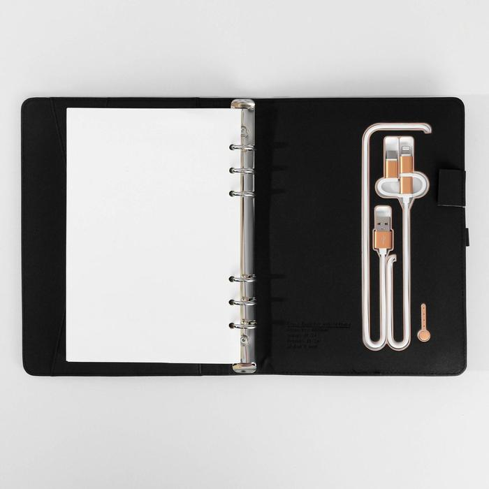 Набор состоит из блока листов для записей в количестве 80 листов: их вы со временем можете заменить на новый блок. Также в этом ежедневнике предусмотрен внешний аккумулятор на 8000 mAh, изящно скрытый на задней обложке. Зарядное устройство дополнено переходником, проводами с разъемами USB, micro-USB, Type-C и Lightning и кнопкой включения-выключения, расположенной рядом. Кроме этого внутри на обложке есть место под карандаш, кармашки для банковских карт и билетов.