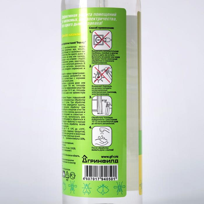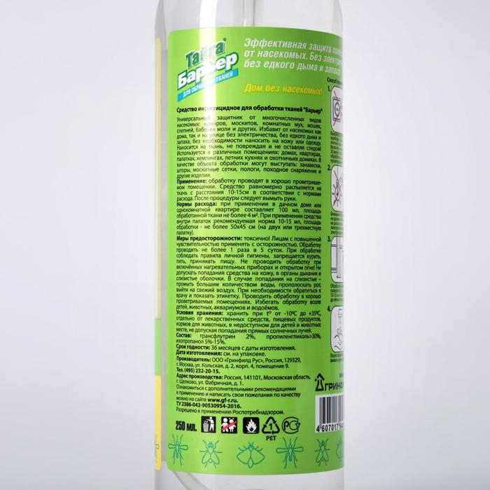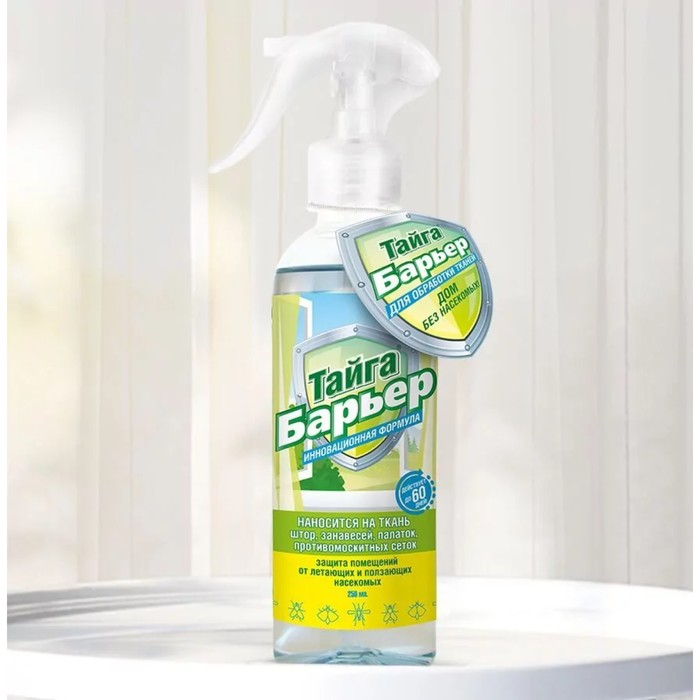 Инсектицидное средство «Тайга Барьер» предназначено для защиты человека от летающих и ползающих насекомых без применения электрических приспособлений, без вредного для здоровья дыма, пятен и посторонних запахов. Выпускается в виде спрея в флаконе объемом 250 мл.Состав препаратаОсновное действующее вещество трансфлутрин – 2%, пропиленгликоль > 30%, изопропанол – 5% - 15%.Способ применения Перед началом работы выключить нагревательные приборы, газовые и электрические плиты, дать им остыть. Включать не ранее чем через 30 минут после окончания обработки и тщательного сквозного проветривания. ВАЖНО: средство не должно попадать на работающие лампы накаливания и нагретую электропроводку. Обработке подвергаются шторы, москитные сетки, пологи, походное снаряжение и другие впитывающие влагу поверхности. Одежду на человеке обрабатывать запрещено! Распылить средство над тканевыми поверхностями с расстояния 10-15 см. Держать пульверизатор в вытянутой руке. Норма расхода средства: для однокомнатной квартиры или дачного дома – 100 мл, при этом площадь обрабатываемой поверхности не должна превышать 4м2. Для 2х-3х местной палатки норма расхода 10-15 мл, допускаемая площадь обрабатываемой поверхности – 50 см2. После обработки обязательно вымыть руки с мылом.