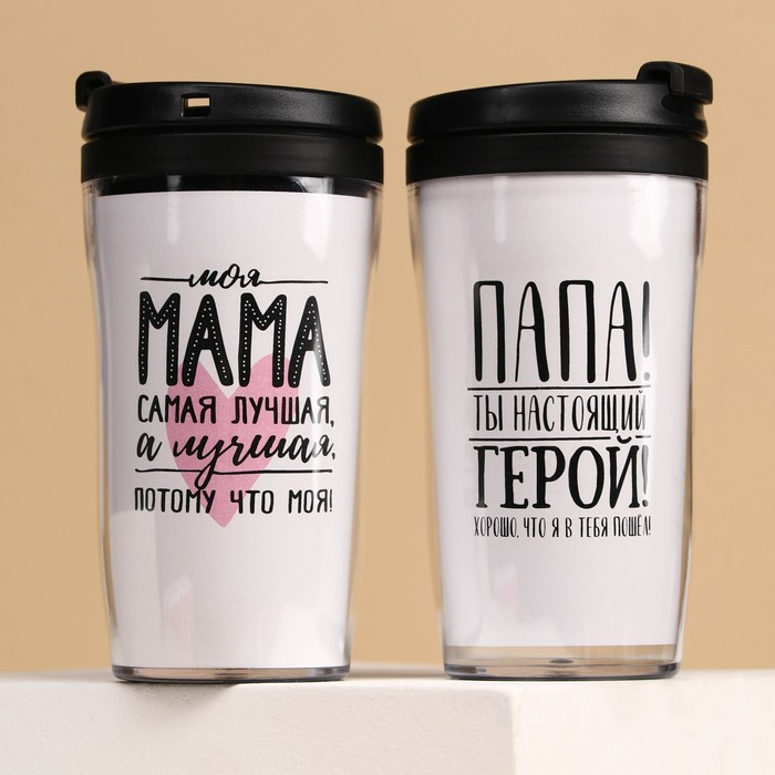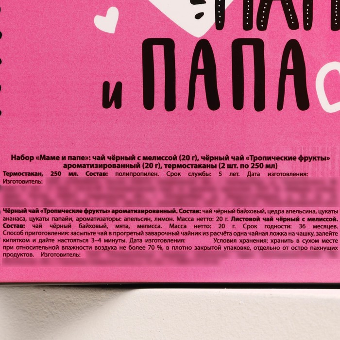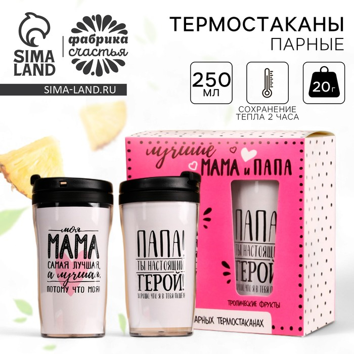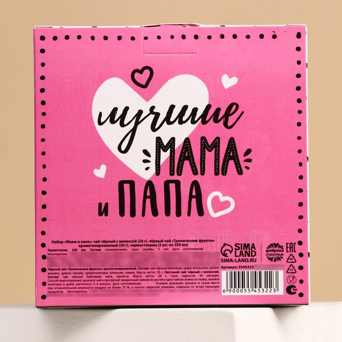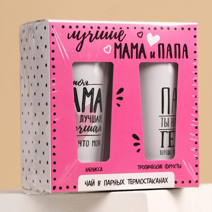 Набор парных термостаканов с чёрным чаем, 2 шт. х 250 мл. «Маме и папе», мелисса 20 г., тропические фрукты 20 г.
