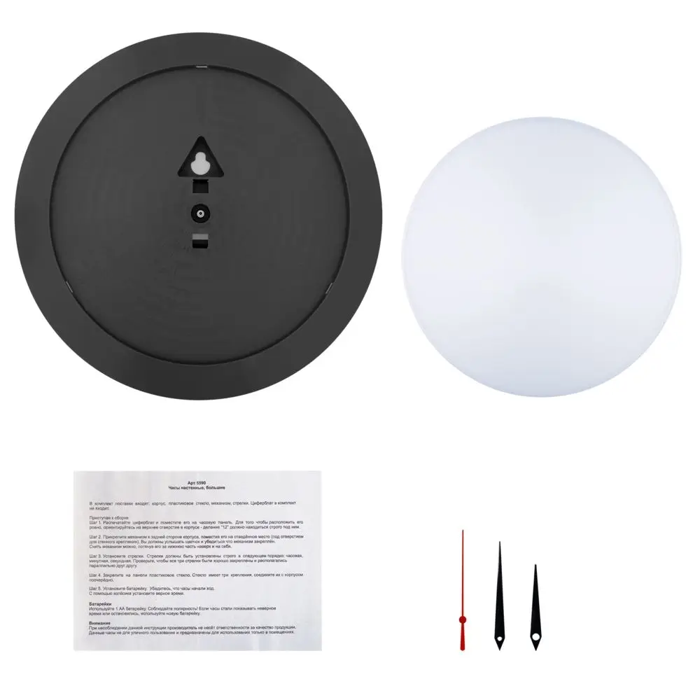 Часы поставляются в разобранном виде: корпус, крышка, стрелки, механизм и индивидуальная упаковка — коробка. Часовая и минутная стрелки — черного цвета, секундная — красного цвета.