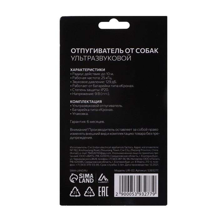 Отпугиватель собак Luazon LRI-09, ультразвуковой, питание от "Кроны" (в комплекте)