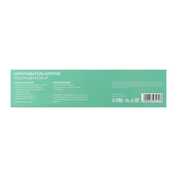 Отпугиватель кротов LuazON LRI-30 экологически безвреден и безопасен для людей и домашних животных. Площадь воздействия: до 800 квадратных метров. Рабочая частота: 400 кГц ± 0 кГц. Работает от солнечной батареи.