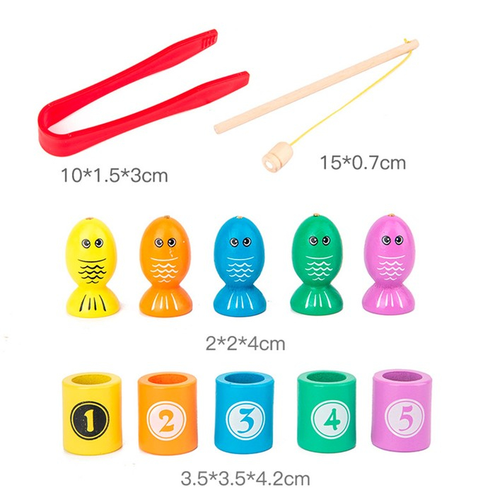 В набор входит 5 стаканчиков и 5 магнитных рыбок, удочка с магнитным крючком, пинцет.