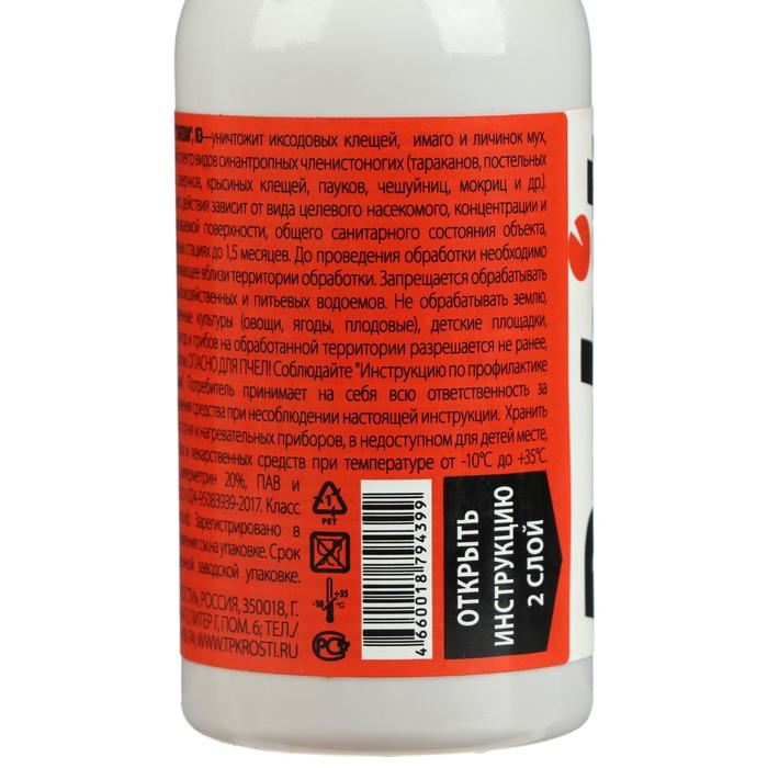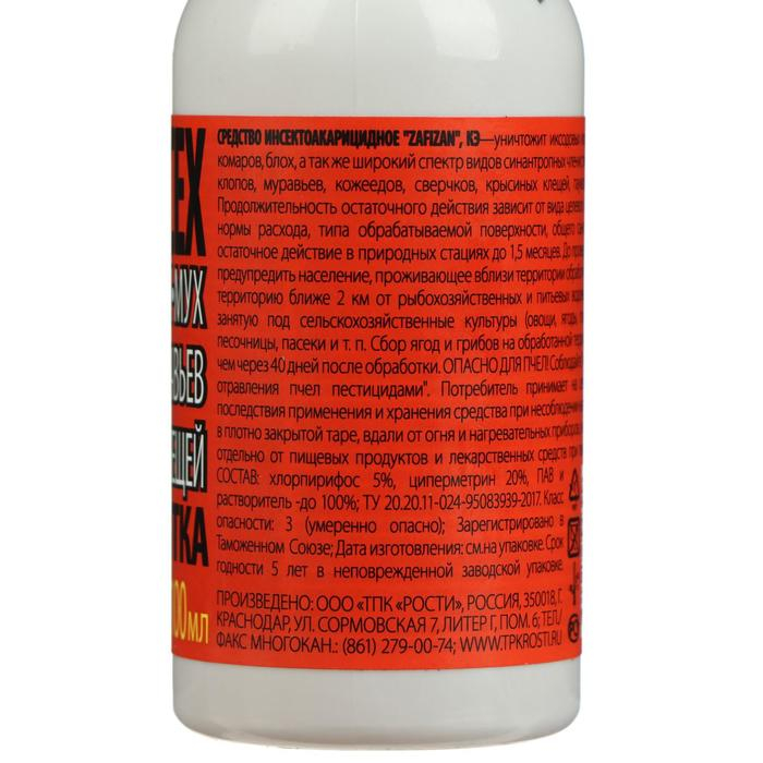 Средство инсектоакарицидное Zafizan (Зафизан) - уничтожит искодовых клещей, имаго и личинок мух, комаров, блох, а также широкий спектр видов синатропных членистоногих. Представляет собой концентрат эмульсии, прозрачная подвижная жидкость светло-коричневого цвета.СОСТАВЦиперметрин 20%, хлорпирифос 5%, вспомогательные вещества и растворитель до 100%.СВОЙСТВАСредство обладает острым инсектицидным действием в отношении широкого спектра видов синантропных членистоногих. Продолжительность остаточного действия зависит от вида целевого членистоногого, концентрации и нормы расхода, типа обрабатываемой поверхности, общего санитарного состояния объекта. Эффективность действия средства зависит также от уровня чувствительности к циперметрину популяций членистоногих на обрабатываемых объектах: при наличии популяций, резистентных к пиретроидам, активность средства может быть снижена.Средство по параметрам острой токсичности при введении в желудок относится к 3 клас-су умеренно опасных веществ, при нанесении на кожу – к 4 классу мало опасных веществ, по ГОСТ 12.1.007-76. По степени летучести средство относится ко 2 классу опасности по Классификации химических веществ по степени летучести. Средство обладает выраженным раздражающим действием при однократном нанесении на кожу и на слизистые оболочки глаз; выявлен слабый сенсибилизирующий эффект.Рабочая концентрация 0,1 % в.э. (по ДВ) по параметрам острой токсичности при введении в желудок относится к 4 классу мало опасных веществ по ГОСТ 12.1.007-76, вызывает слабое раздражающее действие при однократном нанесении на кожные покровы и слизистые оболочки глаз. При ингаляционном воздействии по зоне острого биоцидного эффекта аэрозоли 0,1% в.э. относятся ко 2 классу опасности, по зоне подострого биоцидного эффекта к 3 классу умеренно-опасных в соответствии с Классификацией степени опасности средств дезинсекции.Для циперметрина установлены следующие нормативы: ПДКв.р.з. 0,5 мг/м3 (аэрозоль + пары, 2 класс); ПДКв.р.з 0,04 /0,01 мг/м3.Для хлорпирифоса: ОБУВв.р.з. 0,3 мг/м3 (аэрозоль + пары), ПДКат.н.м. 0,0002 мг/м3 (аэрозоль) для применения.НАЗНАЧЕНИЕДля уничтожения нелетающих членистоногих (тараканы, постельные клопы, муравьи, кожееды, сверчки, крысиные клещи, пауки, чешуйницы, мокрицы и др.) на объектах различной категории: в жилых, нежилых, производственных, хозяйственных и подвальных помещениях; на объектах коммунально-бытового назначения (гостиницы, общежития, спорткомплексы); на предприятиях пищевой промышленности, общественного питания, магазинах ( в санитарные дни); в детских (кроме спален и игровых комнат) и медицинских (кроме палат стационаров) организациях в отсутствие взрослых и детей; на объектах железнодорожного транспорта и метрополитена. Область применения: персоналом организаций, занимающихся дезинфекционной деятельностьюСПОСОБ ПРИМЕНЕНИЯРабочие водные эмульсии (р.э.) готовят непосредственно перед применением. Для этого средство смешивают с водопроводной или отфильтрованной водой ближайших водоемов, постоянно и равномерно размешивая в течение 5 минут. Готовую эмульсию следует использовать в течение 8 часов.Для нанесения средства используют крупнокапельную распыливающую аппаратуру различных типов, предназначенную для распыления растворов и эмульсий инсектицидов по поверхностям. Основное услови