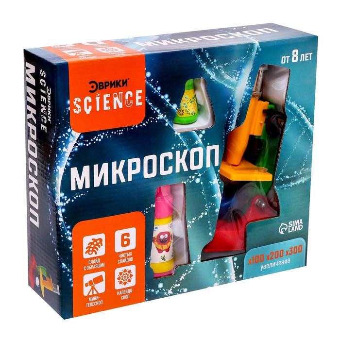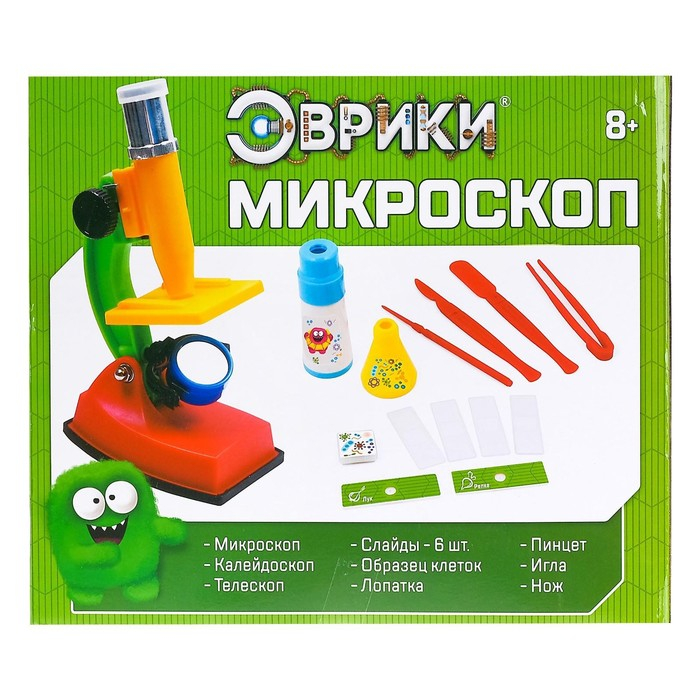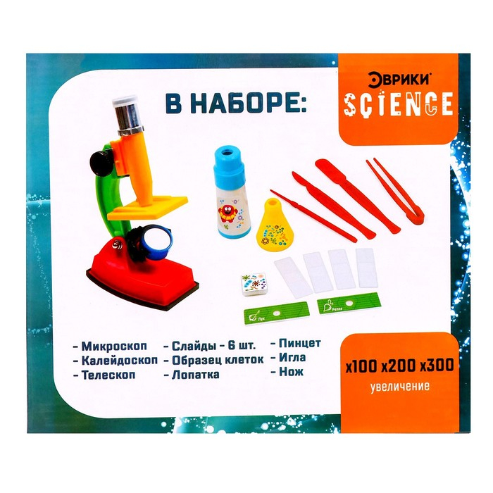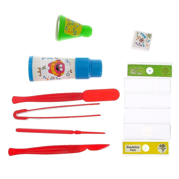 Набор биолога, 14 предметов: калейдоскоп, микроскоп, 4 слайда, 2 образца клеток, пинцет, нож, лопатка, игла, образцы
