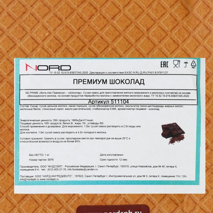 - Для получения мягкого мороженого 1 кг сухой смеси растворить в 2,3 – 2.5 л воды или молока, смешать и выдержать 20 минут перед заливкой во фризер.