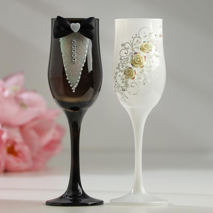 Набор свадебных бокалов "Молодожёны", с лепниной, чёрно - белый