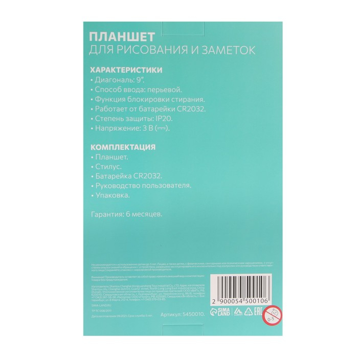 Предоставьте детям платформу для творчества вместе с детским планшетом для рисования и заметок LuazON. Будьте уверены в прочности изделия в любых ситуациях благодаря прочному пластику. Питание планшета осуществляется при помощи батарейки CR2032.