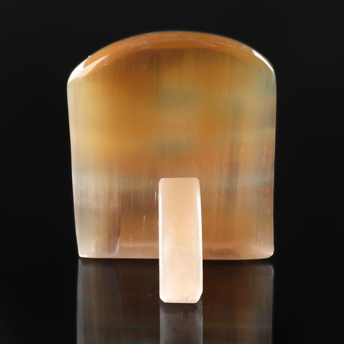 Селенит — это материал, который относится к разновидности гипса, жёлто-розового цвета с шелковистым блеском. Внутренние волокна расположены плотно, это даёт эффект «кошачьего глаза». Изделия из селенита завораживают игрой света, нежными тонами и хрупкостью. При прикосновении есть ощущение исходящей энергии.