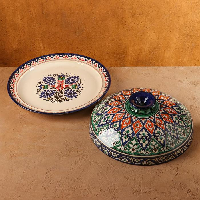 Блинница Риштанская Керамика "Цветы", 38 см, синий микс