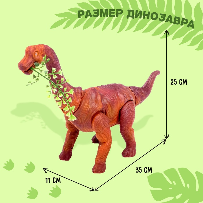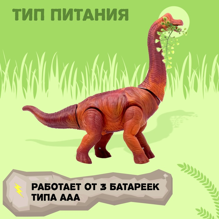 Достаточно вставить в игрушку 3 батарейки типа ААА, и брахиозавр оживёт. Он пойдёт вперёд, размахивая хвостом и поворачивая шеей. При этом животное будет рычать, а его глаза — ярко светиться. Юный палеонтолог придёт в неописуемый восторг!