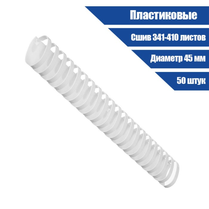 Пружины для переплета пластиковые, d=45мм, 50 штук, сшивают 341-410 листов, белые Гелеос