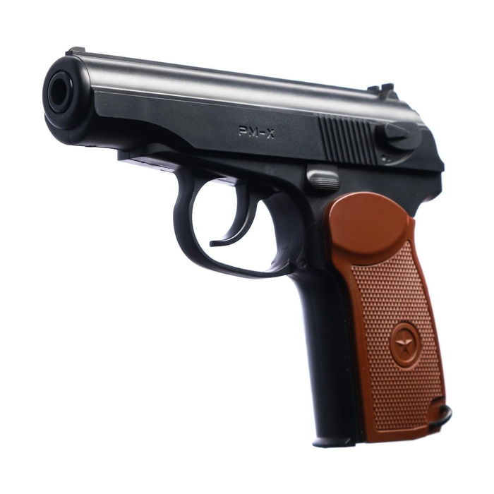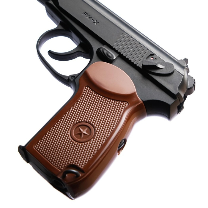 На вылете пуля набирает скорость до 100 м/с, при этом показатель дульной энергии пистолета Borner PM-X не превышает 3 Дж, поэтому приобрести его могут все желающие, без необходимости оформления разрешений и лицензий. Внешний вид пистолета также соответствует боевому прототипу в его классическом исполнении – корпус окрашен в черный цвет, на рукоятке пластиковая коричневая накладка с рифлением и пятиконечной звездой в центре.