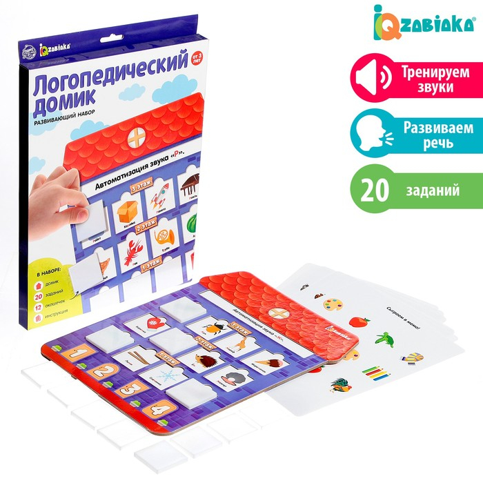 Внутри набора ребёнок найдёт домик с 12 окошечками, карточки и разные варианты логопедических заданий.
