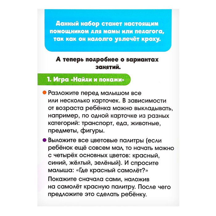 Существует 3 базовых цвета — красный, жёлтый и синий, — из которых можно получить все остальные. Расскажите ребёнку об этом законе и покажите на примерах из набора.