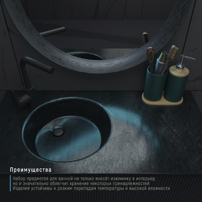 Набор предметов для ванной не только внесёт изюминку в интерьер, но и значительно облегчит хранение некоторых принадлежностей. Изделия устойчивы к резким перепадам температуры и высокой влажности. Также стоит отметить качество аксессуаров — набор при правильном уходе прослужит вам очень долго.
