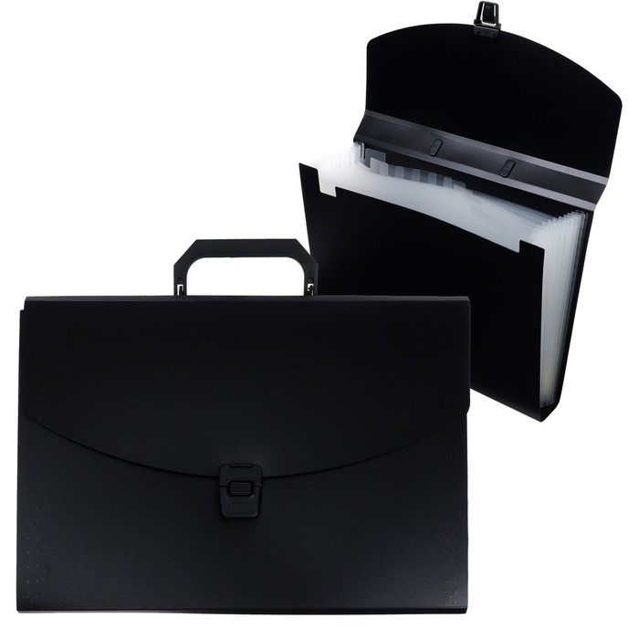 Вместительная папка-портфель предназначена для безопасной транспортировки документов. Она позволит упорядочить бумаги и сохранить их в целости. Формат: А4. Количество отделений: 13. Толщина: 700 мкм. Вмещает до 300 листов. Цвет: чёрный.