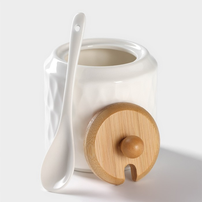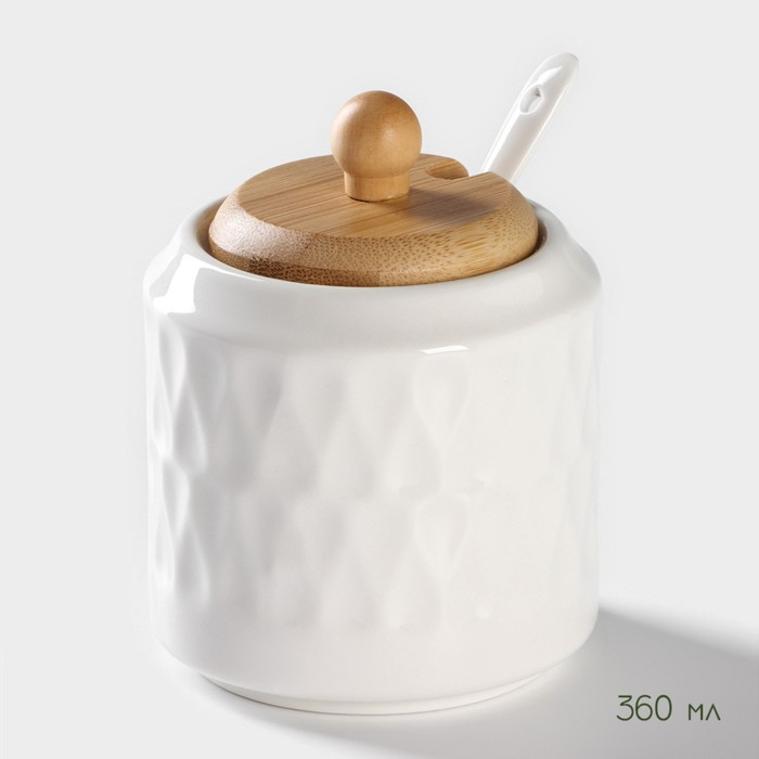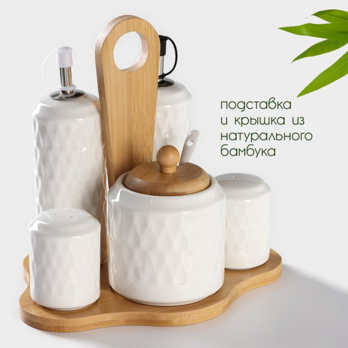 Набор керамический для специй и соусов на бамбуковой подставке BellaTenero, 5 предметов: 2 соусника 200 мл, сахарница 360 мл, солонка 120 мл, перечница 120 мл, цвет белый