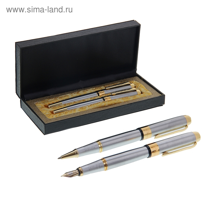 Набор подарочных ручек Calligrata "Платина" 2 штуки: перьевая, капиллярная, в кожзам футляре, серебристые с золотыми вставками