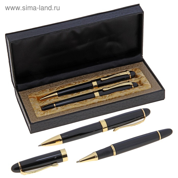 Ручки шариковые, 2 шт.: капиллярная, шариковая поворотная, подарочные "Бизнес" в кожзам футляре, чёрные