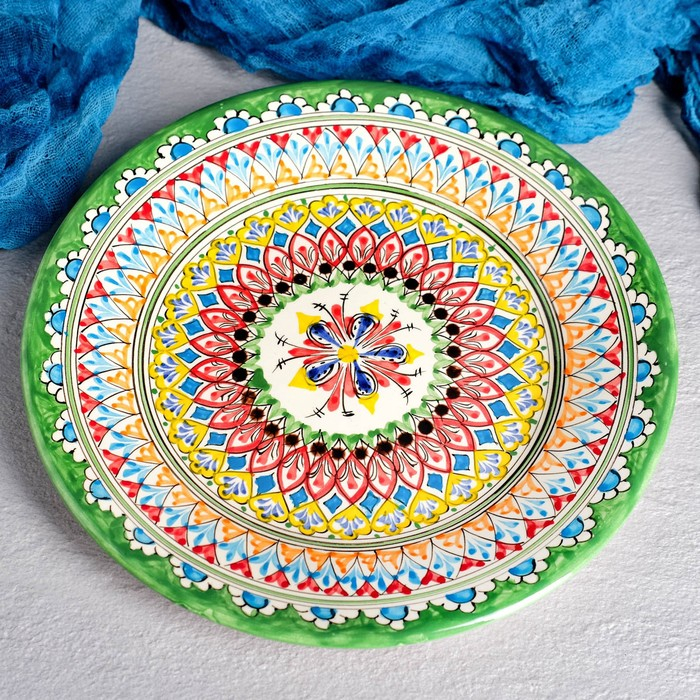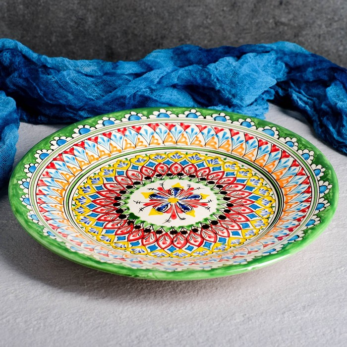 Тарелка Риштанская Керамика "Узоры", зелёная, плоская, 27 см