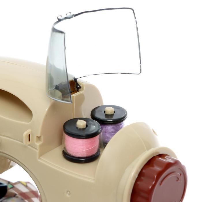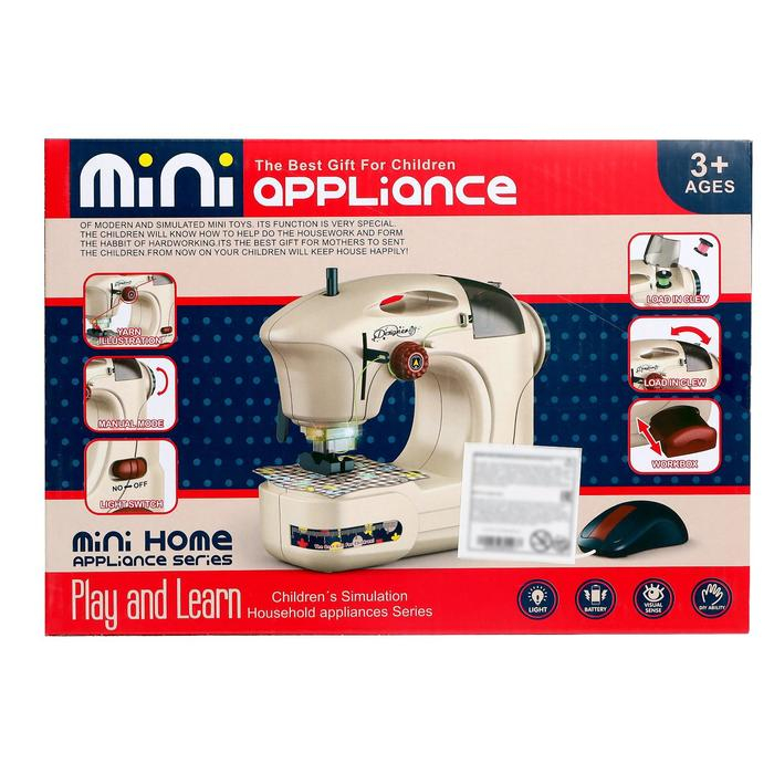 Размер швейной машинки: 24 × 8,5 × 19 см. Машинка имеет световые эффекты. Она не шьёт. Для работы понадобятся 2 батарейки типоразмера AA, в комплект не входят.