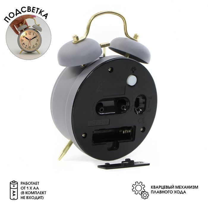 - Будильник оснащён кварцевым механизмом с дискретным ходом стрелок.