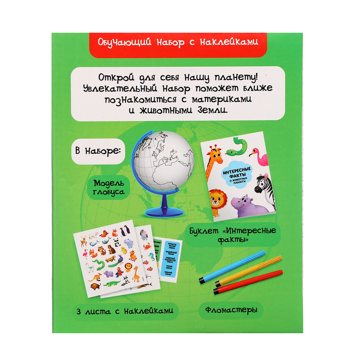 С обучающим набором малыш в игровой форме познакомится с материками, а также узнает, какие животные обитают на них.