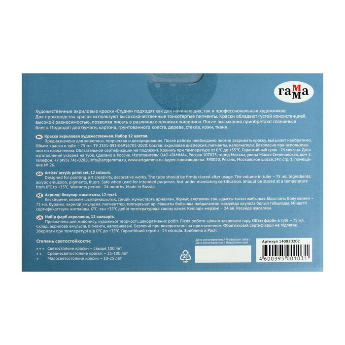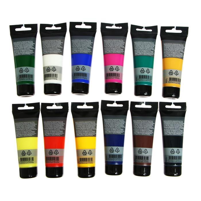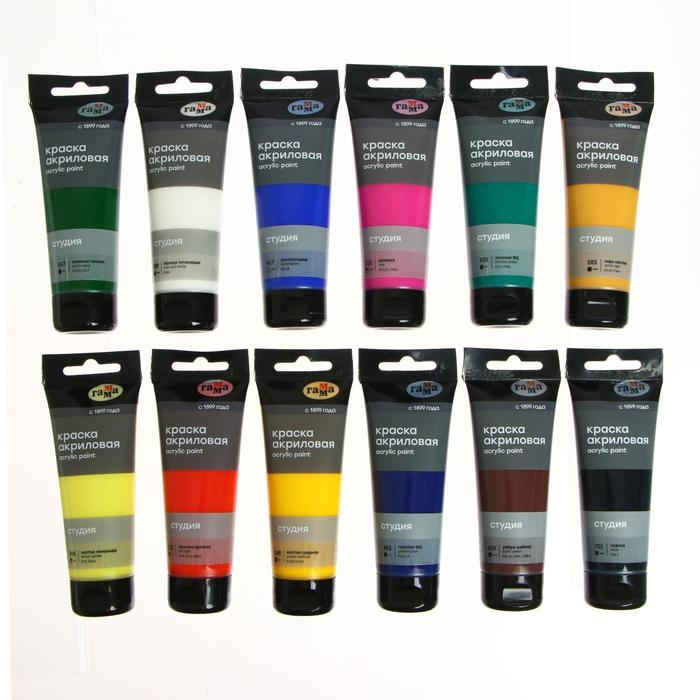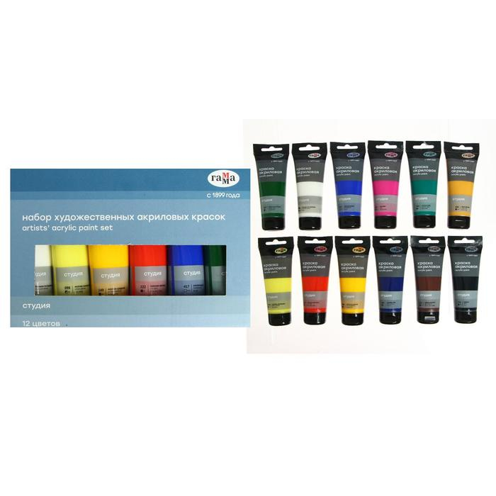 Краска акриловая в тубе, набор 12 цветов х 75 мл, Гамма "Студия", морозостойкая, в картонной коробке, 140820202