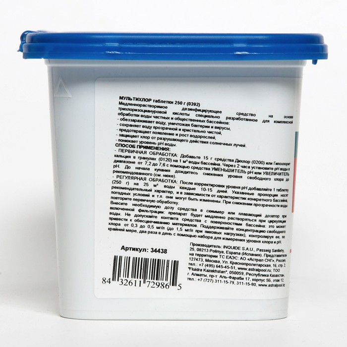 Описание: медленно растворимые многофункциональные таблетки на основе стабилизированного хлора, в состав которых входят так же альгицид и флокулянт: не только обеспечивают эффективную дезинфекцию, но и предотвращают появление водорослей и мутности, обеспечивая кристальную чистоту воды.