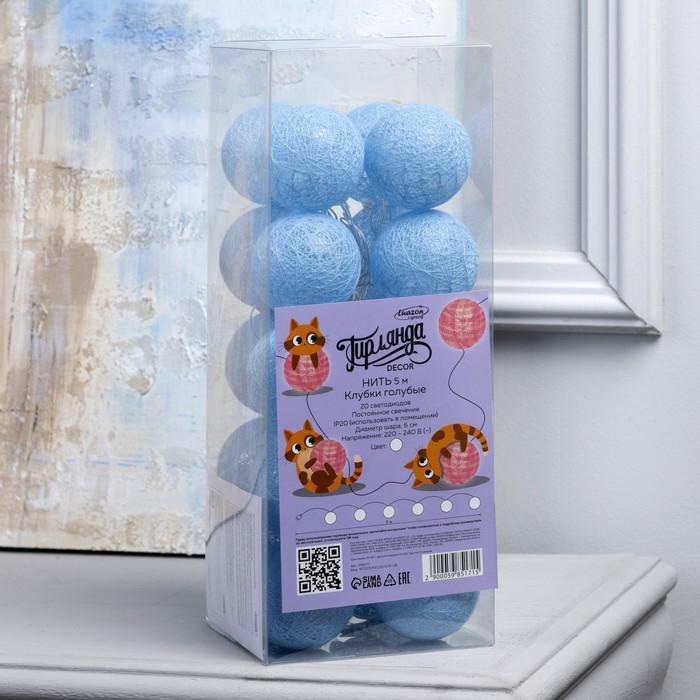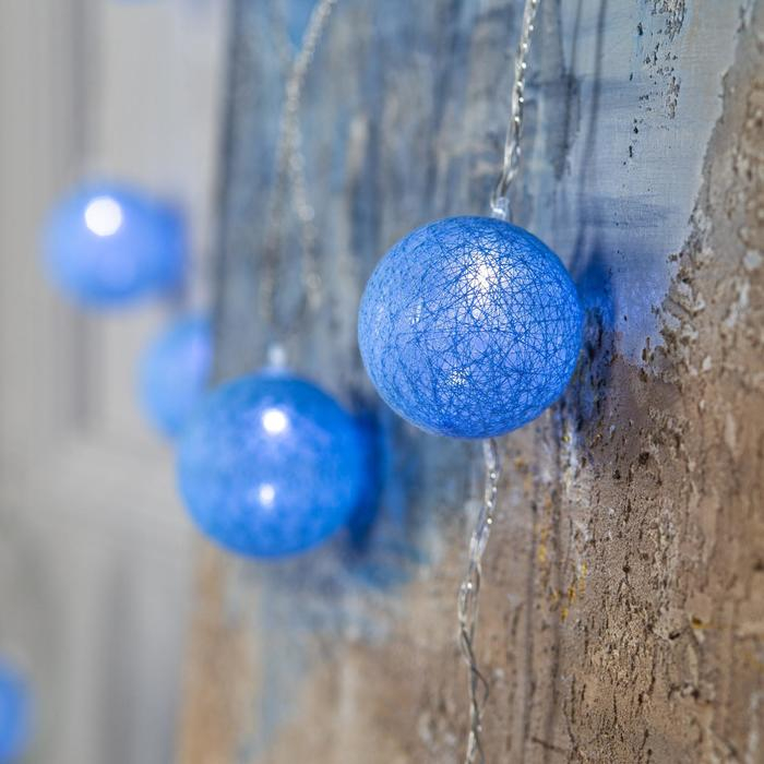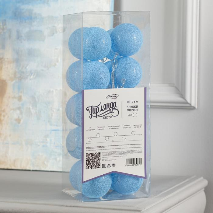 Гирлянда «Нить» 5 м с насадками «Клубки голубые», IP20, прозрачная нить, 20 LED, свечение белое, 220 В