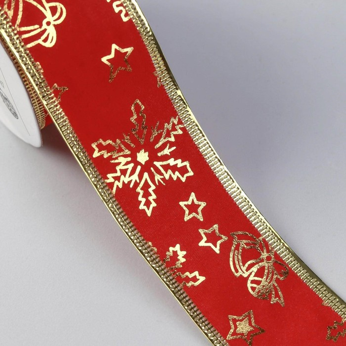 Лента бархатная с металлической нитью «Снежинки», 38 мм × 9 ± 0,5 м, цвет красный/золотой