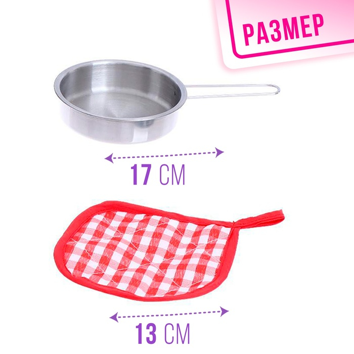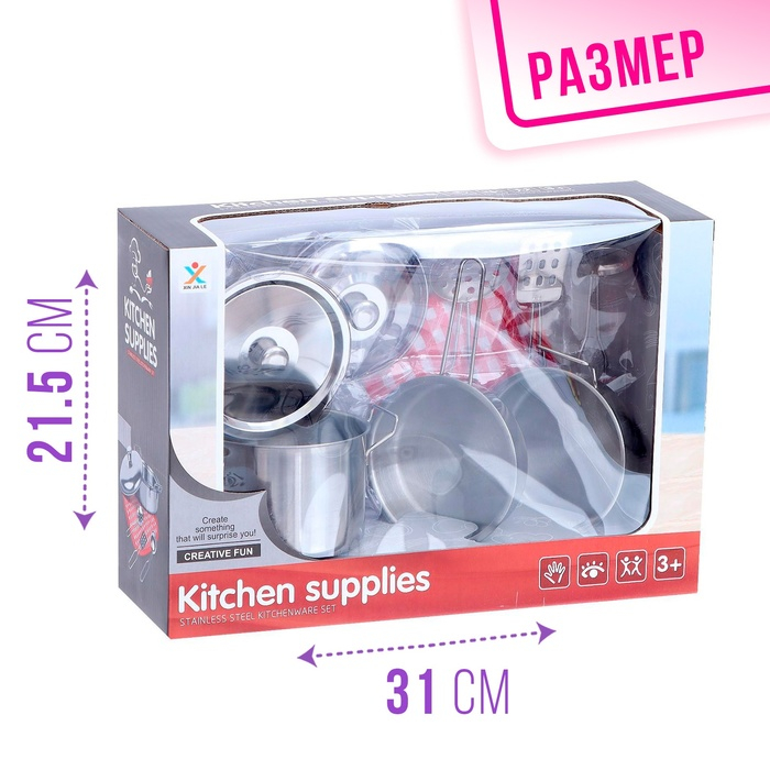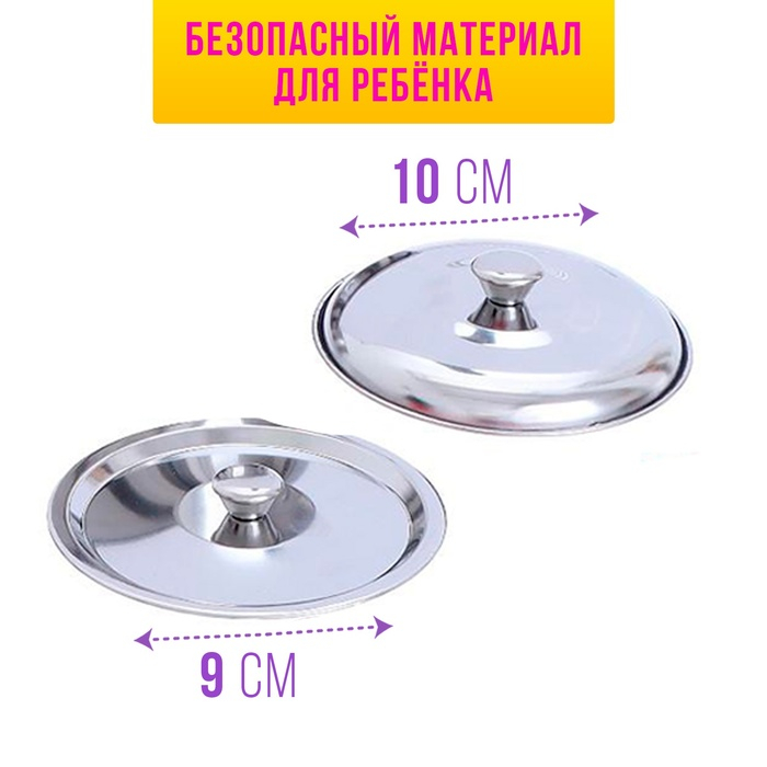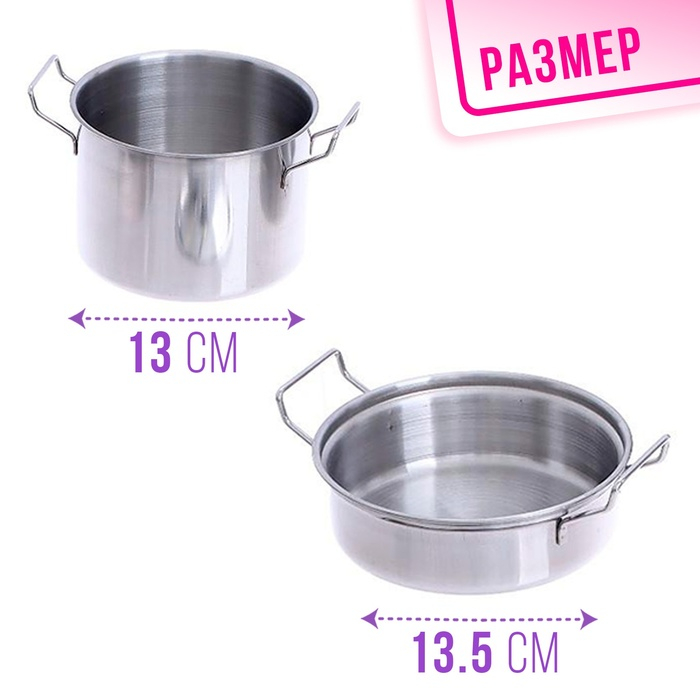 Набор металлической посуды — альтернатива взрослой кухонной утвари. В процессе игры малышка сможет абсолютно безопасно пользоваться принадлежностями для готовки: они лёгкие, простые в использовании, их размеры рассчитаны на ребёнка. Дочурка с удовольствием будет баловать свои игрушки кулинарными шедеврами, перенимая мамины рецепты.