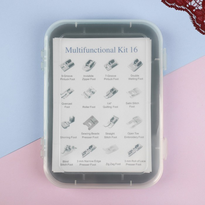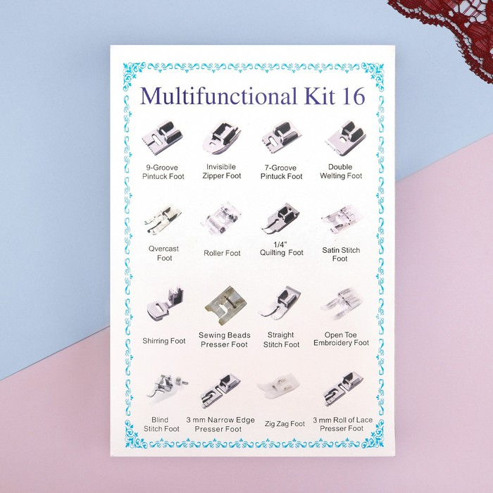 В набор входят 16 лапок для выполнения определённых задач и строчек. Набор поможет упростить выполнение основных и декоративных операций, и улучшить качество работы.