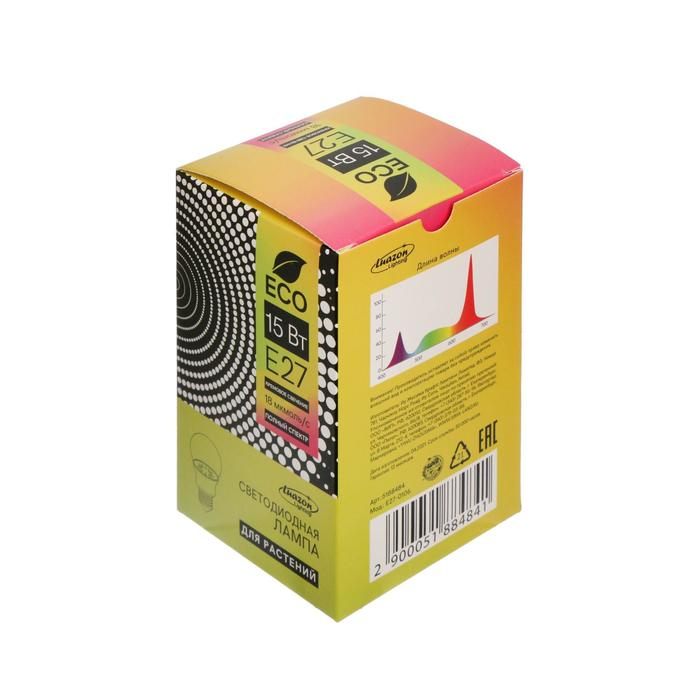 Фитолампа светодиодная Luazon Lighting, А60, E27, 15Вт, IP44, 220В, 270°, полноспектральная