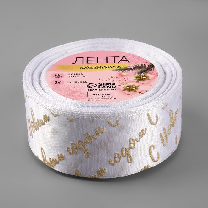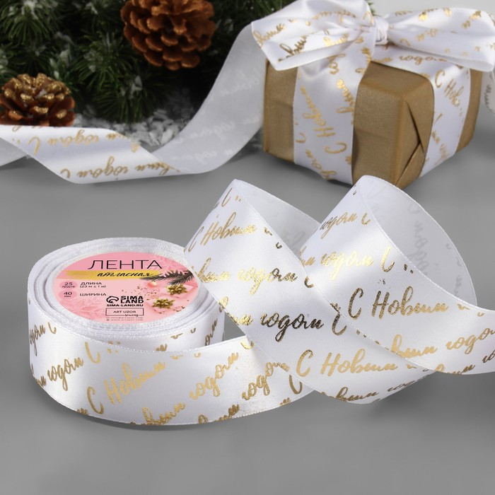 Лента атласная с тиснением «С Новым годом», 40 мм, 23 ± 1 м, цвет белый/золотой №01