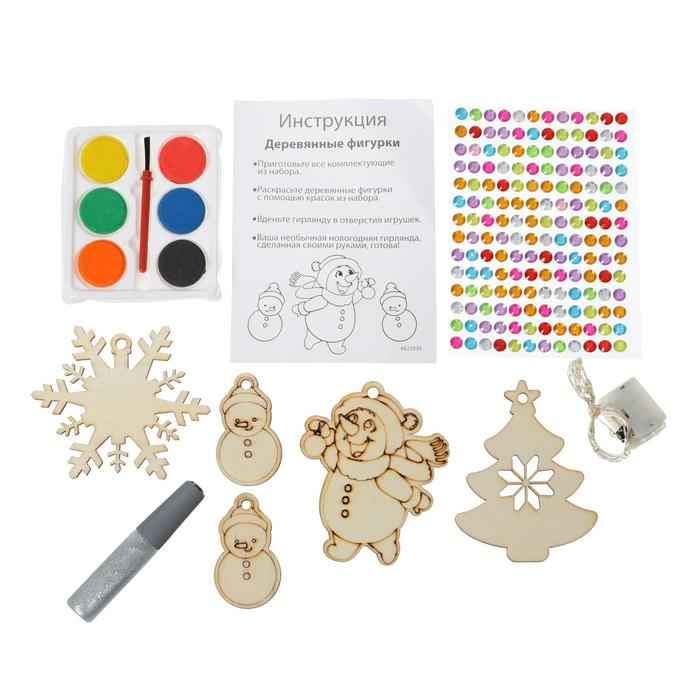 - Подготовьте все комплектующие из набора.Раскрасьте деревянные фигурки, дайте им просохнуть.