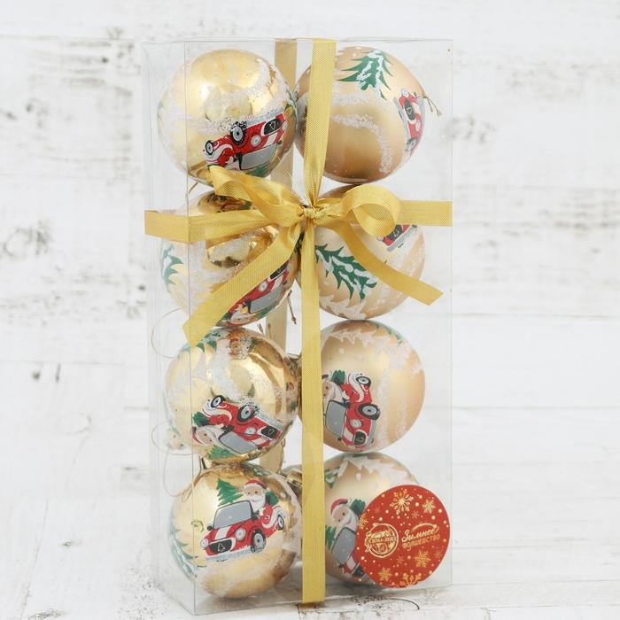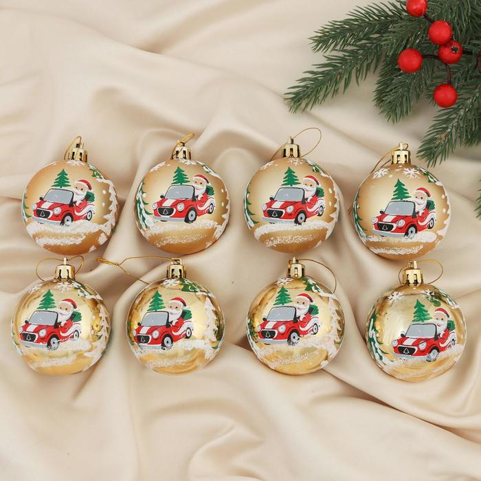 Набор шаров пластик d-6 см, 8 шт "Дед Мороз на автомобиле" золото