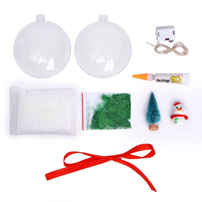 В наборе: ёлочный шар-основа, фигурки, гирлянда, декор.