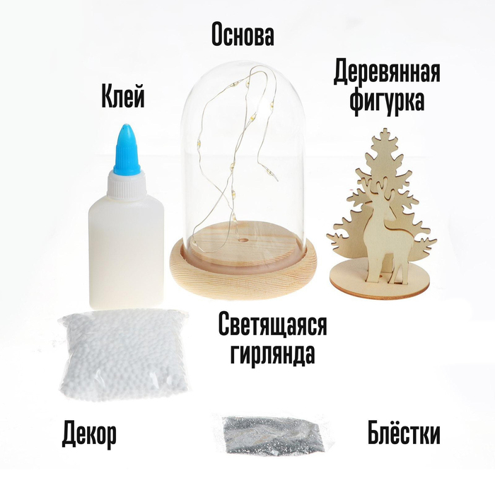 В наборе: основа, деревянная фигурка, клей, блёстки, декор, светящаяся гирлянда.